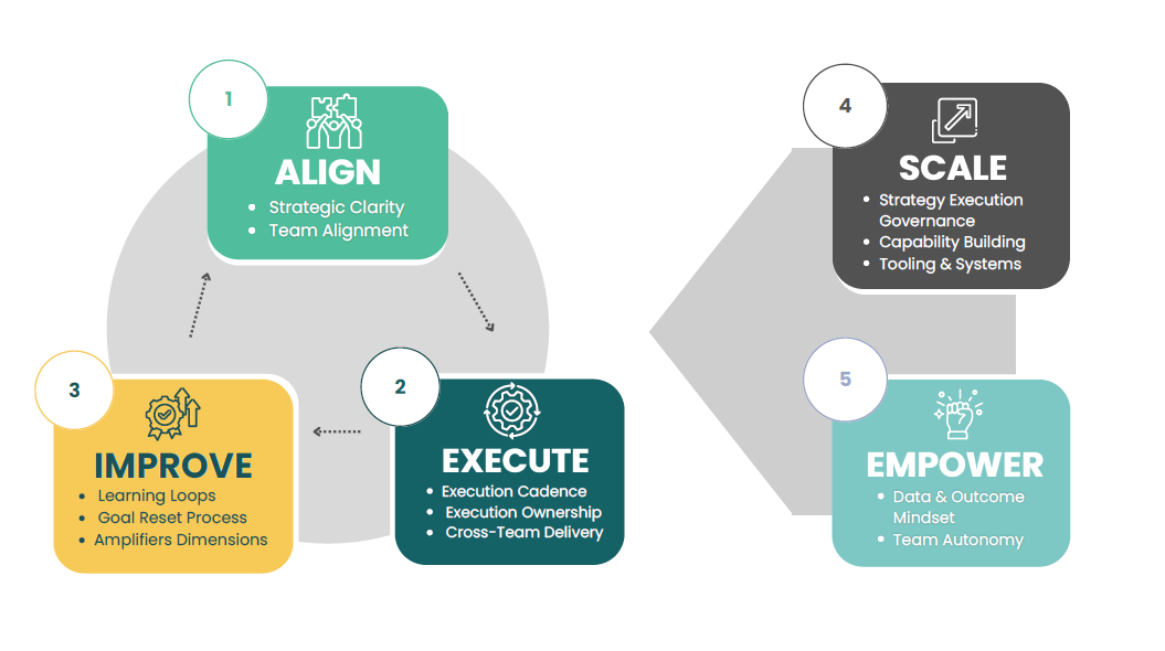 It reflects how well teams align, deliver, and adapt across five key dimensions — Align, Execute, Improve, Scale, and Empower.